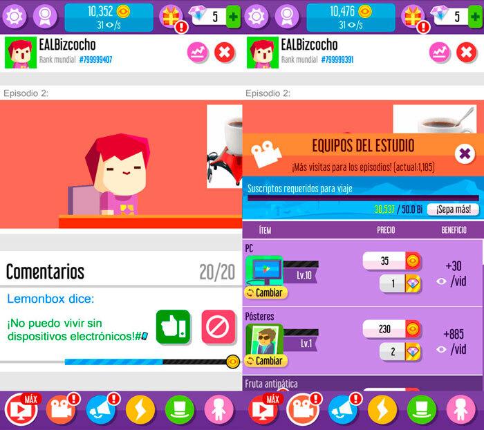 Lo hemos probado y podemos decir que es un juego entretenido. Tienes que esperar a que cada vídeo se haga pero puedes pulsar sobre la pantalla para que vaya más rápido. O incluso tomar café para trabajar más rápido. También puedes invertir tu tiempo en promocionar tu canal o conseguir material para ganar más visitas por segundo.