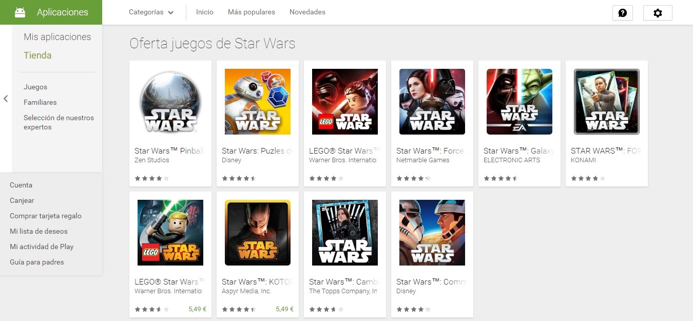 Con motivo del Día de Star Wars que se celebra en todo el mundo la Google Play Store ha sacado todo su arsenal y nos ofrece desde su página web y su aplicación en Android toda una oferta de juegos disponibles de Star Wars, tanto rebajas en sus precios como en los micro-pagos que se hacen dentro de sus aplicaciones. Si Google quería sacarse el título de Jedi, lo ha conseguido pero bien.