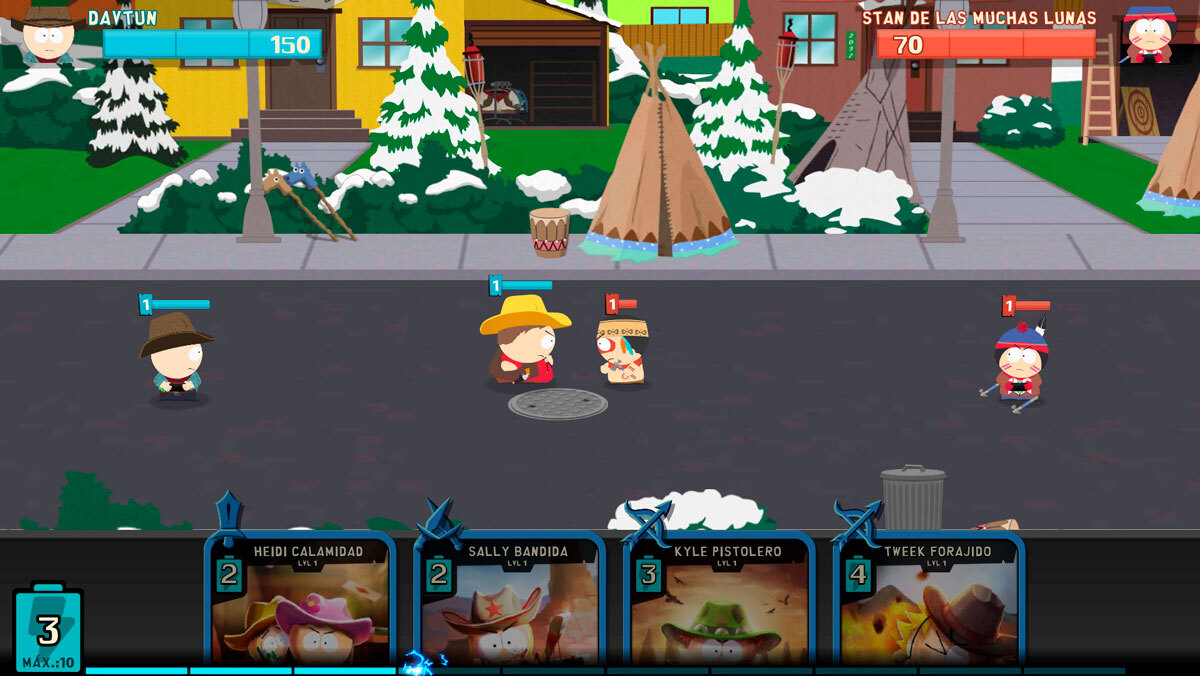 Lo curioso es que South Park: Phone Destroyer es un juego de cartas inspirado en célebres como HearthStone. Ponemos cartas con diferentes personajes y ataques delante nuestra, que atacan a nuestro contrario y a sus personajes. Tenemos que acabar con el rival combatiendo con nuestras cartas.