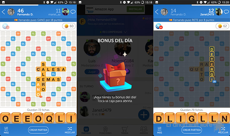 Dentro de cada partida el desarrollo se da por turnos, por lo que podemos tener varias partidas empezadas de forma simultánea. Y si no sabemos qué palabra poner podremos barajar las letras e incluso usar las retrospectivas, que nos dan pistas sobre movimientos que podríamos haber realizado y que quizás nos sirvan en siguientes turnos.