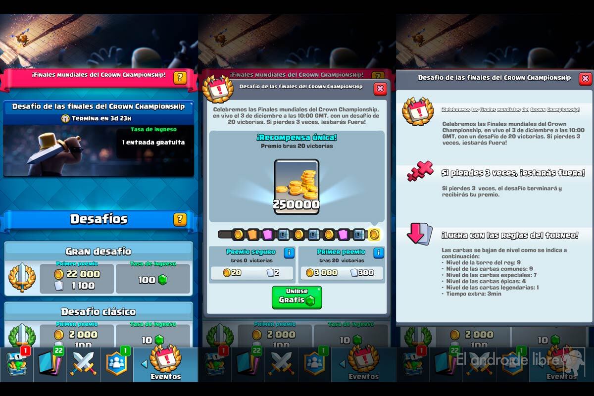 Un desafío de estas características, y conmemorativo de las finales mundiales del campeonato de la corona, debía tener un premio a la altura. Dificultad también, obviamente: necesitas 20 victorias para llegar a la meta. Por el camino irás adquiriendo diversos premios que van desde oro a cartas especiales, épicas y cofres. ¿Que no superas ninguna fase perdiendo tres veces seguidas? El premio de consolación son 20 monedas y 2 cartas comunes.