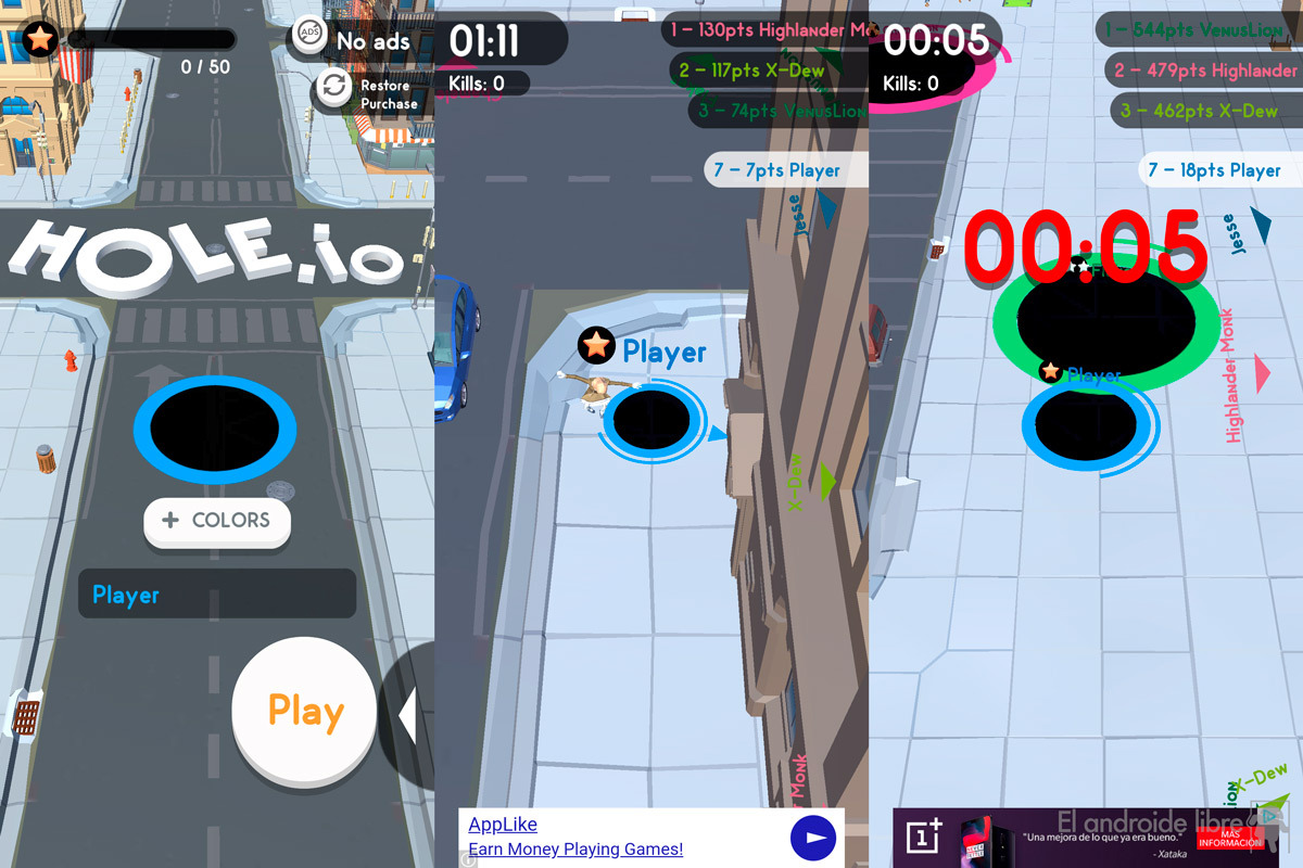 Simple, pero muy divertido. También está cargado de anuncios, como suele ocurrir en los títulos freemium. Cuando descargues Hole.io acuérdate de no darle permiso ni de ubicación ni de acceso al teléfono: funciona igual. Eso sí, necesita conexión a Internet.