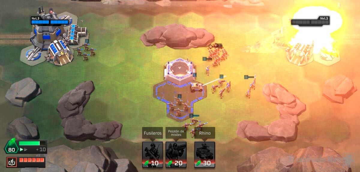 Infantería, vehículos, bases para crear unidades… Todo se va generando según el tiempo y la dificultad de creación. Luego somos nosotros los que debemos ponerlo todo en el tablero según la mejor estrategia para conseguir la victoria. Como luchamos contra adversarios reales deberemos ir adaptando la técnica en base a las necesidades; mejorando el equipo para que esté lo más fuerte posible.
