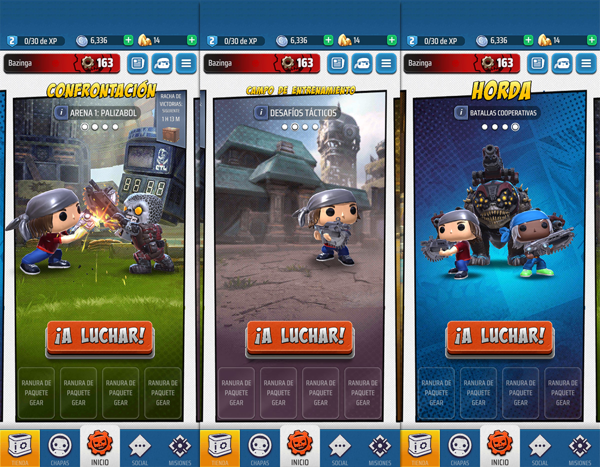 En la pantalla principal podemos personalizar nuestro personaje, aunque las opciones son un escasas, elegir entre los distintos modos de juego y mejorar nuestro equipo. Si ponemos el foco en los modos de juego que Gears POP! pone a nuestra disposición nos encontraremos cuatro posibilidades.