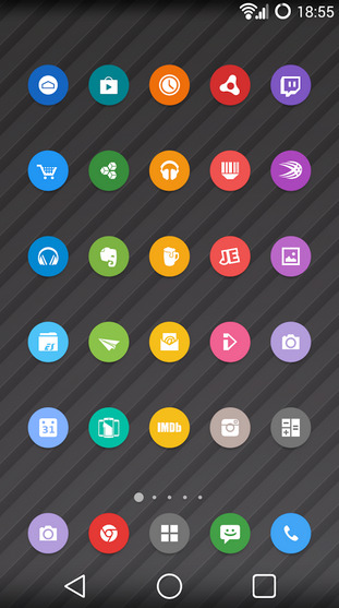 Los iconos de hoy son minimalistas casi al máximo. Nos encontramos con un círculo a modo de base y sobre él, un icono muy minimalista en color blanco. El color del círculo compagina en la mayoría de los casos con el del icono original. Por ejemplo, Google Play Music, el fondo, es naranja.
