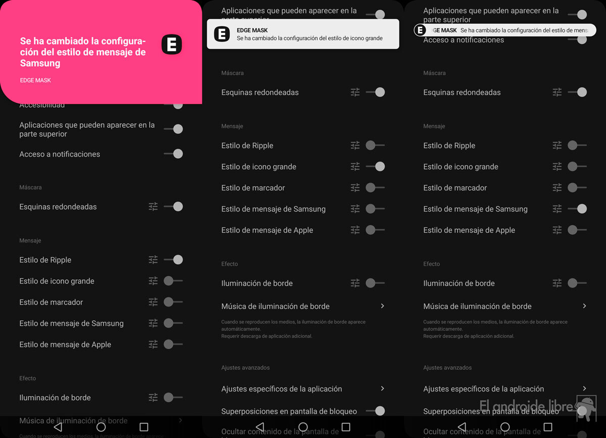 Como decíamos, lo más habitual es que las notificaciones emergentes tengan el aspecto de un rectángulo que va de lado a lado de la pantalla. Con Edge Mask puedes aplicar otros diseños; que van desde estilos inspirados en marcas concretas (Samsung o Apple) a bloques de color que ofrecen aún más visibilidad que una notificación corriente.