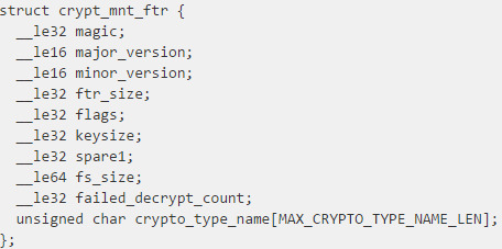 Android, además, utiliza una estructura denominada crypto footer, la cual almacena todos los parámetros de encriptación. Es muy similar a LUKS, pero simplificándola y omitiendo algunas características (sólo almacena una copia de la master key y no tiene otras características, como la opción de recuperar la clave completa después de que haya sido borrada del disco, gracias a la clave cifrada por segmentos o también omite la suma de comprobación de la master key).