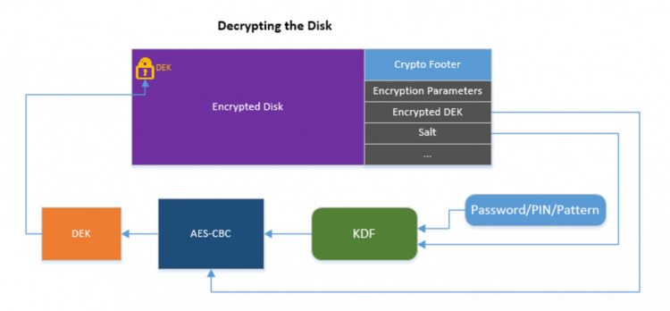 El FDE de Android utiliza dm-crypt  del framework de Linux para implementar una encriptación de disco transparente para la partición de datos de usuario (/data).
