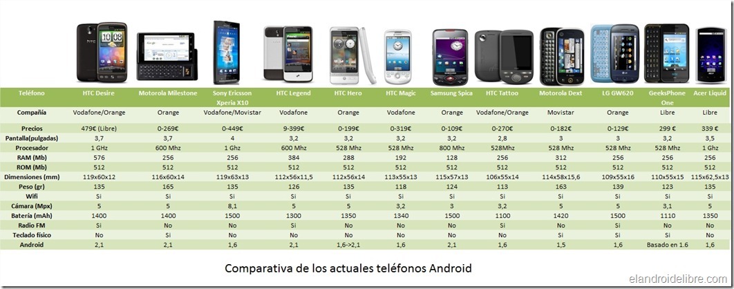 Os dejo con una pequeña tabla resumen que he realizado para hacernos un poco la idea del precio y las características de los teléfonos Android a día de hoy en España