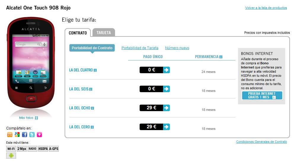 El nuevo Alcatel One Touch 908 está disponible desde los 0 Euros con contrato hasta sus 79 Euros en su modalidad libre. La operadora que lo subvenciona en este caso es Yoigo.