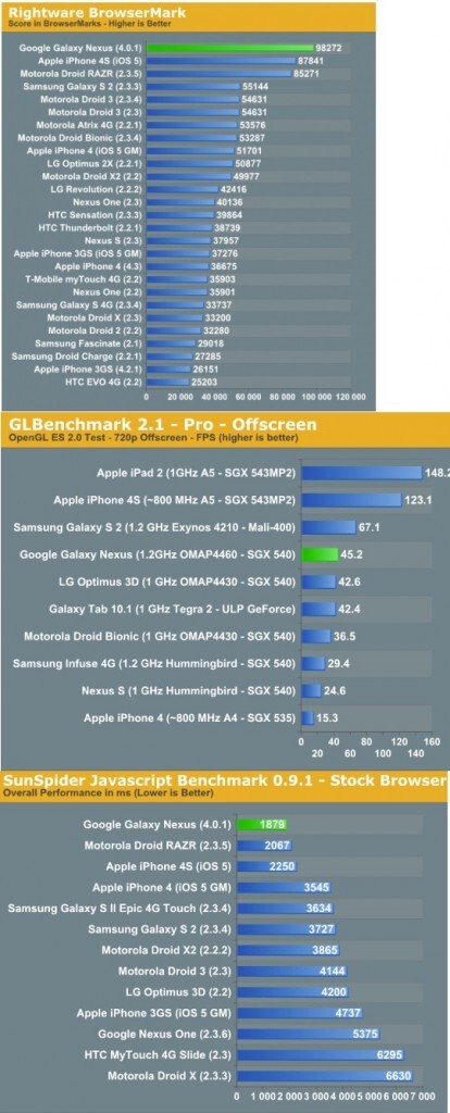 Vamos pues allá con la ronda de enfrentamientos y con algunas gráficas que nos dejan ver cómo el Galaxy Nexus gana en velocidad y navegación, pero se desinfla frente al iPhone en gráfica, cosa que por otro lado ya sabíamos.