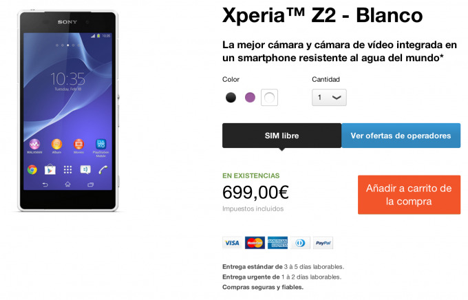 El Sony Xperia Z2 es uno de los terminales estrella de este año que más nos ha sorprendido. Hace poco pudimos tenerlo en nuestras manos y el resultado ha sido bastante bueno. Sin embargo por una razón u otra se ha ido retrasando su venta al público. Finalmente y después de que durante el día de ayer lo hiciese en los demás países de Europa, ya lo tenemos a la venta en España a un precio oficial de 699€.
