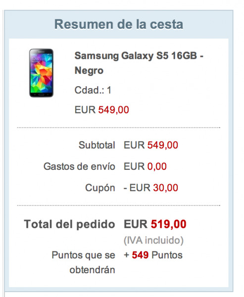 La oferta en cuestión es la siguiente; se trata de Rakuten que tiene en su web tanto el S5 en blanco como en negro. En realidad el precio al que se vende es de 549€, bastante bueno, pero si le añadimos un código de descuento de 30€ se nos queda en los 519€, un precio realmente agresivo.