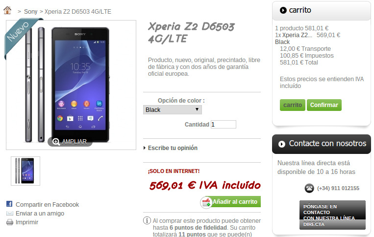 Sin embargo, si estáis interesados en adquirir el smartphone estrella de Sony para este 2014, aquí os dejamos una buena oferta. En la tienda online SpainMoviles tienen a la venta el Sony Xperia Z2 negro de 16GB por 569€ más gastos de envío.