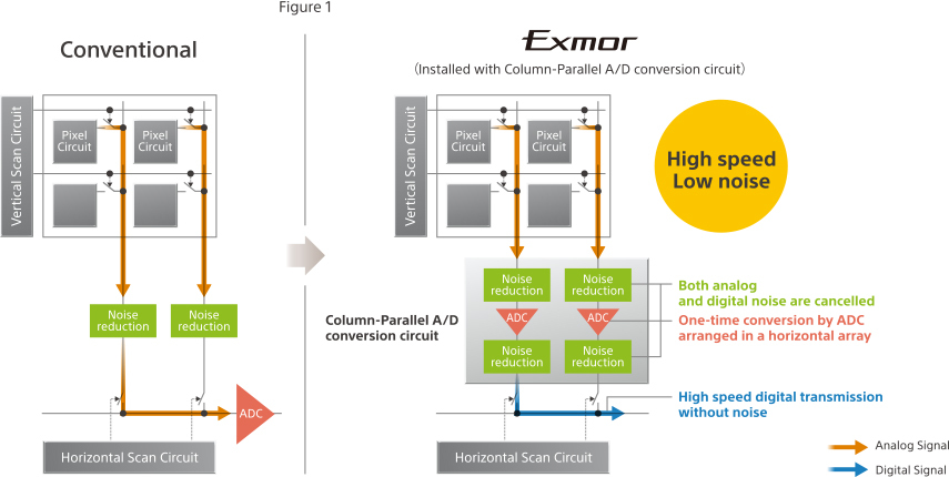 Con esa disposición, se permite a los circuitos que funcionen simultáneamente, aumentando la velocidad de procesado y permitiendo un incremento de la velocidad de transferencia sin aumentar el ruido. Exmor R, el CMOS retroiluminado
