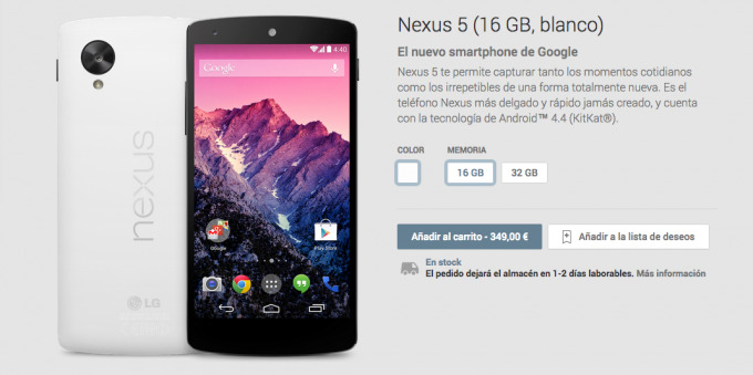 Tras unas semanas sin stock en Google Play del Nexus 5 y en las que parecía que Google había decidido abandonarlo en favor de su phablet el Nexus 6, el modelo blanco de 16 GB blanco vuelve a estar disponible en Google Play por 349€, con un envío de dos días, ideal para regalo de Reyes.