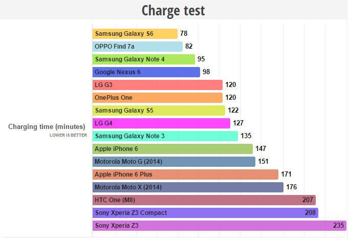 Así pues, en la misma página han recopilado información sobre la duración de la batería de los teléfonos antes analizados, con la principal sorpresa de que la familia Z3 pese a que ofrecía la carga más lenta, son quienes ofrecen mayor autonomía. Otro terminal destacado sería el Galaxy Note 4, que siendo uno de los equipos con mayor batería, también es de los que menos tarda en cargar.