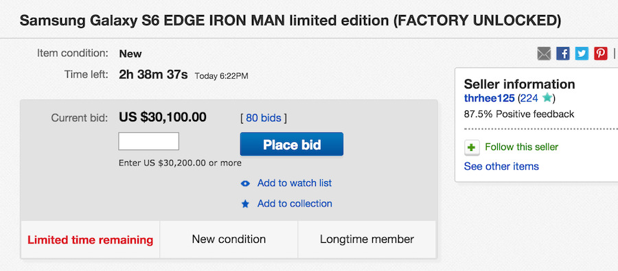 Varios usuarios de Ebay han puesto a la venta varias unidades del Galaxy S6 Edge Iron Man Edition, los precios de varios de ellos han superado los 2000 dólares, pero una subasta en concreto está alcanzando cotas desmesuradas.