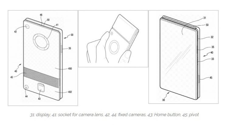 La imagen, que no es que tenga demasiada calidad, nos muestra cómo sería un móvil con pantalla plegable que podría abatirse para ocupar todo el dispositivo, en una serie de patentes que ha presentado el fabricante coreano vemos además algunas otras curiosidades como la posibilidad de agregar lentes a la cámara.