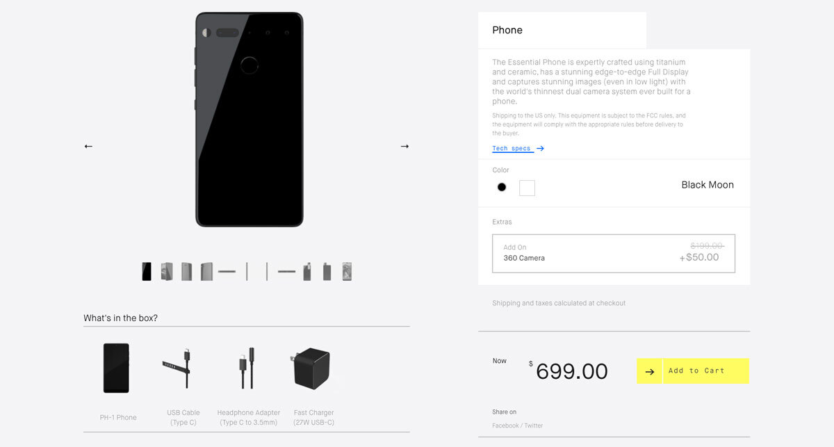 Las malas noticias son que, como anuncia la página web, de momento no envían el Essential Phone fuera de EEUU. Es decir, sólo podremos reservar una unidad si vivimos en USA. No sólo los europeos y los asiáticos nos quedamos sin poder conseguirlo, también les ocurre a los canadienses, mexicanos y al resto de americanos.