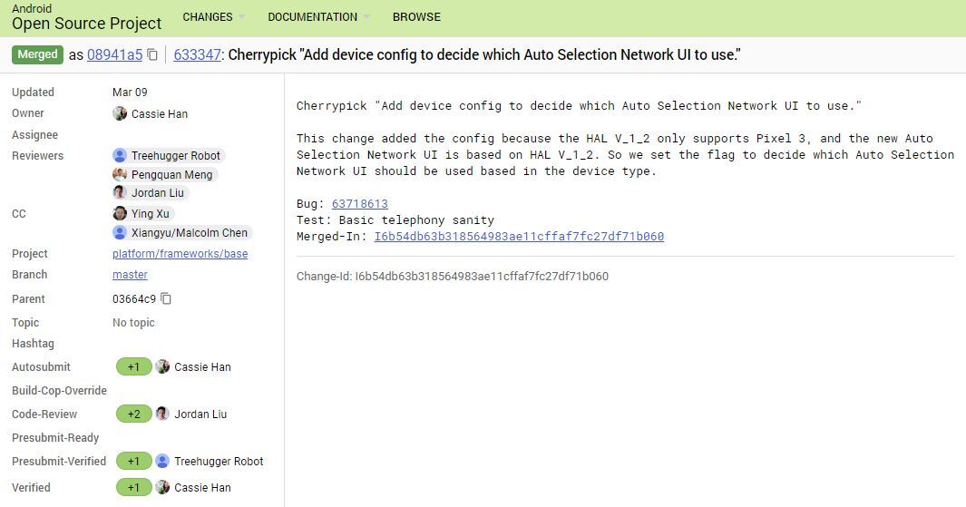 Sin entrar en mucho detalle sobre el código, hablan de una característica de la versión V_1_2 de la capa de abstracción de hardware (HAL). El cambio del código hace referencia a que esa versión es únicamente compatible con el Pixel 3. La función en concreto, parece hacer referencia a una nueva selección automática de red, característica que según el código fuente, sólo sería exclusiva de este nuevo modelo.