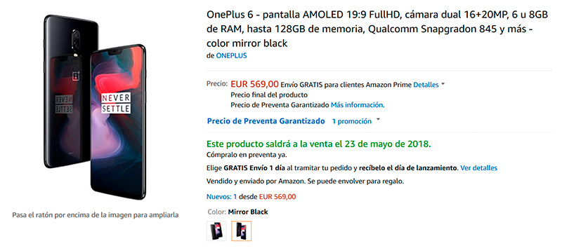 Nos hemos pasado por la web de Amazon y ya están disponibles los nuevos OnePlus 6 para reservar en pre compra. Si lo hacemos el terminal se enviará el 23 de mayo, un día después del anunciado por Carl Pei, el CEO de OnePlus.