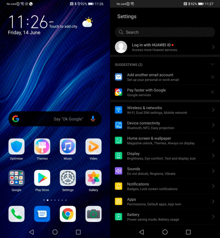 En esta llama la atención que el fondo de los ajustes sea oscuro, pero es que EMUI 9 ya tiene un modo oscuro habilitado. Eso sí, vemos cómo aquí la barra de búsqueda de Google del escritorio principal se ajusta también a ese color, una característica de Android 10.