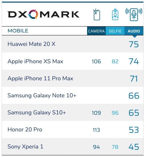 En estos momentos, el Huawei Mate 20X ha resultado ser el móvil con mejor sonido en las pruebas, seguido del iPhone XS Max. Curiosamente, el nuevo iPhone 11 Pro puntúa menos que el iPhone del año pasado, y en cuarto y quinto lugar tendríamos los Galaxy Note 10+ y S10+.