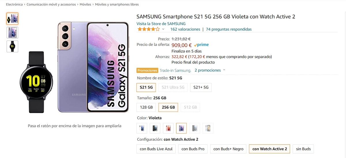 Se trata de una promoción temporal en Amazon España, en la tienda propia de Samsung. No necesitamos códigos de promoción para poder obtener este reloj de regalo en la compra del teléfono. Lo único que tenemos que hacer es elegir el modelo dentro de esta familia de teléfonos que deseamos comprar. Estos son los modelos que podemos comprar y sus precios: