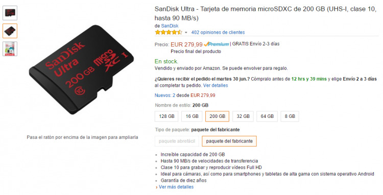 Este modelo de tarjeta microSD ya está disponible para su compra, con envío de 2-3 días gratis si eres Premium. Su precio de venta, unos abrumadores 279,99 euros. Para quienes lo vayan a necesitar, no sólo para dispositivos Android sino para cámaras de vídeo que tengan que grabar mucho contenido a 4K puede ser una solución interesante. La velocidad de transferencia y la capacidad acompañan a grabar más tiempo de vídeo a alta calidad.