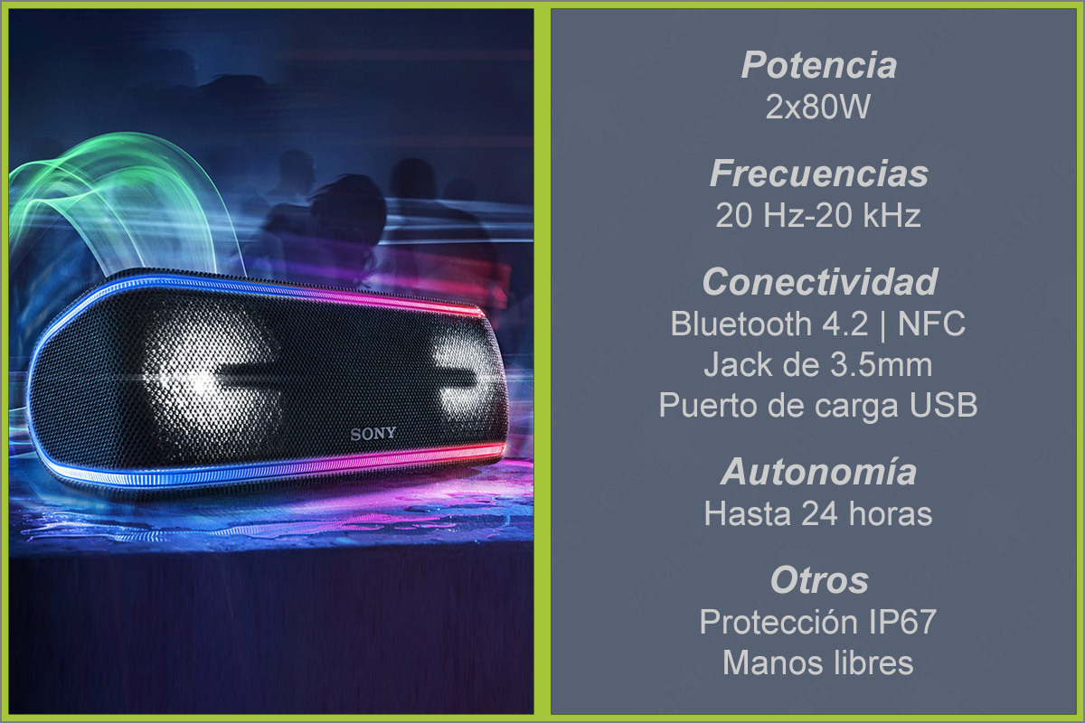 Nuestra primera recomendación trae toda la experiencia multimedia, al más alto nivel. Deslumbra con sus impresionantes 80W estéreo de potencia y su amplia conectividad, desde bluetooth hasta jack de audio. Además dispone de una autonomía de hasta 24 horas y protección IP67.