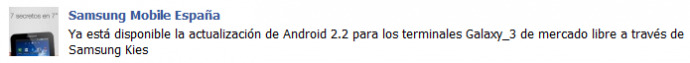 Tal y como llega os lo soltamos. Nos hemos enterado por parte de nuestros amigos de HTCmania de que Samsung Galaxy 3 se actualiza oficialmente a Android 2.2, Froyo. Hace escasos días se actualizaban también otros terminales como el Motorola Milestone, terminales que no son de gama puntera, pero que también tienen sus seguidores, y por supuesto sus usuarios. Para ellos, creemos y nos gusta que las empresas no se olviden de que tienen un terminal que lanzaron sin estar al día, y lo pongan al día, quizá no a Gingerbread, pero sí a Froyo, que aporta grandísimos cambios respecto a las versiones anteriores. Parece que algunos realmente no se olvidan, pero hay que seguir apretando para que la felicidad nos llegue a tod@s.