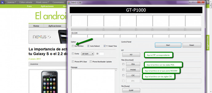 5. Abrimos Odin y lo configuramos de la siguiente manera: ponemos el archivo PDA_XXJVK_Sbl.tar en el campo «PDA», el archivo CSC_OXAJVK.tar en «CSC» y archivo PHONE_XXJVK.tar en «Modem». Además, marcamos la casilla «Reparition» y además cargamos el archivo pit512 en su correspondiente celda.
