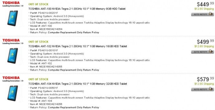 Pero si hay dos cosas que interesan más que las características técnicas de hardware de una tablet son la experiencia de usuario y el precio. Sobre la experiencia de usuario poco podemos contar, ya que no la hemos visto en acción con Honeycomb, pero contamos con que funcione muy bien, sino sería un grave problema. De lo que si podemos hablar es del precio, y es que han salido publicadas tres versiones diferentes de esta tablet en la web de Toshiba, clasificadas según capacidad de memoria interna: