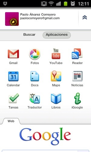 Otra de las funciones, es que al pulsar sobre la barra superior en Más, se despliega un menú con más opciones de búsqueda y además nos ofrece la posibilidad de cambiar a modo Aplicaciones, donde nos mostrará los servicios más usados de Google, desde el Calendario, Reader, Docs… ect así como ver rápidamente con que cuenta estamos logueados, algo que quieren potenciar y mejorar el cambio entre cuentas, ya que cada vez más, las empresas están migrando sus servicios a Google Apps y es cada vez más común tener varias cuentas de Google muy diferentes y diferenciadas.