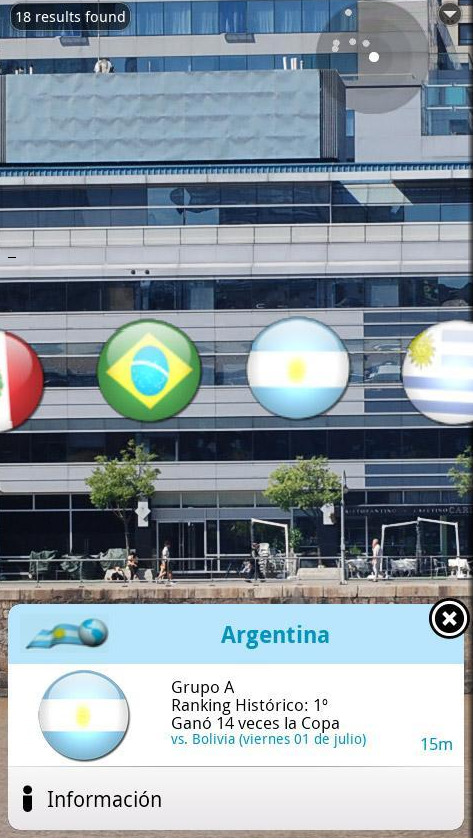 Otra opción es Copa América 2011 disponible en el Market y con visualización de resultados y equipos, así como una opción para visualizar con realidad aumentada donde transcurren los partidos y los estadios. Muy muy completa y actualizada.