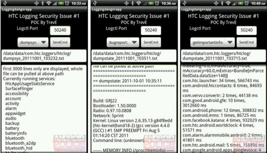 El fallo lo encontramos en el permiso «android.permission.INTERNET», ya que resulta que al llamarlo, uno se encuentra de cara con un montón de información que no es normal que sea compartida. Y es lo que decimos, nuestros smartphones cada día son más nuestra vida, y hay cosas que deberían permanecer totalmente ocultas, sin posibilidad de que nadie acceda a ellas. Concretamente, la información a la que este permiso tiene acceso es a nuestras direcciones de correo electrónico, posiciones del GPS, registros de llamadas y SMS e información de las aplicaciones que se están ejecutando en ese momento. Es concretamente la aplicación HtcLoggers.apk la que recopila toda esta información y a la que luego cualquiera puede acceder a través de la vulnerabilidad del puerto abierto.