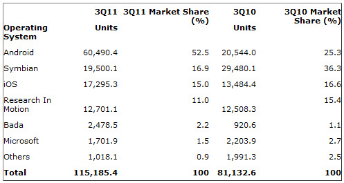 Parece que no hay nada que lo pueda parar.Los datos vienen de Gartner, donde podemos ver que el 52.5% de los teléfonos vendidos en el tercer trimestre de 2011 llevan Android. Centrémonos un poco en las cifras, porque merece la pena. Todo esto significa que de los 115 millones de smartphones que se vendieron en el tercer trimestre de 2011, 60 millones de estos son Android. El sistema operativo móvil de Google deja un 48% restante para repartir entre el resto. Del total Symbian se queda un 19%, iOS un 17%, RIM un 12% y entre Bada, Microsoft y otros se reparten el 5% restante.