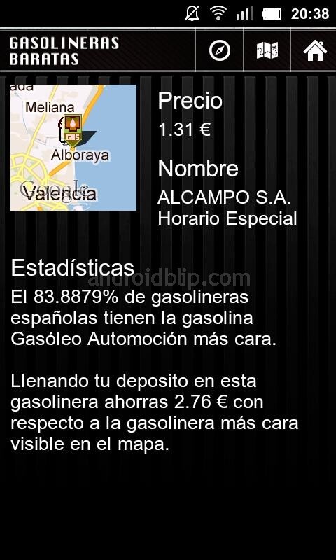En caso de que no sepamos como llegar exactamente al lugar donde se encuentra, pulsaremos en el mensaje y tendremos distintas informaciones. Dichas informaciones son: el nombre de la gasolinera, el horario que tiene y el coste del combustible que usamos. Arriba de la aplicación encontraremos iconos como una brujula y un mapa.Pues bien, si pulsamos encima de la brújula se nos abrirá Google Navigation, el cual nos llevará hasta donde se encuentra la gasolinera. En cuanto al mapa, se nos abrirá Google Maps, el cual nos calculará el tiempo de la ruta hasta la gasolinera.
