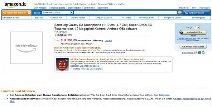 Aunque desde Amazon.de han querido dejarnos más pistas, ya que han habilitado una página sobre el Samsung Galaxy SIII donde se permite su reserva. No incluye ninguna foto, pero nos dan las siguientes características técnicas: