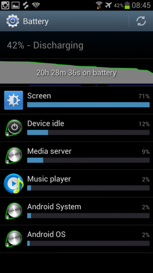 El uso que le ha dado no ha sido excesivamente grande pero sí nos sirve para hacernos una idea de la durabilidad de nuestra batería: cinco horas de música, una docena de fotografías y un vídeo. Evidentemente, a muchos nos saltará la misma duda, ¿y en navegación web? Pues de momento solo tenemos estos datos. Para más inri, parece que solo se ha utilizado bajo red 3G durante una hora y el resto mediante conexión Wifi.