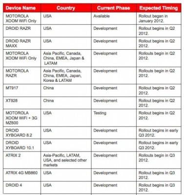 Como se ve en la imagen, se actualizarán los Droid RAZR, Droid RAZR MAXX y la XOOM 3G casi que ya mismo. Atrix, Atrix 2, Droid Bionic, Droid 4 and Xyboard lo recibirán a lo largo del próximo cuatrimestre.