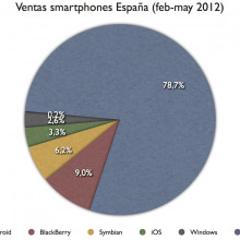 Nuestro amado androide está arrasando en ventas en España, ya que se podría decir que cuatro de cada cinco móviles inteligentes vendidos llevan Android en sus venas (78’7%). Le sigue de lejos, lejísimos, a años luz, RIM (9%), Symbian (6’2%) e iOS (3’3%). Detrás de Apple se encuentra Windows Phone con un 2,6% de cuota. Estos datos son de entre marzo y mayo.