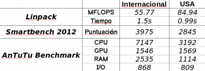 Por lo que puede apreciarse en los benchmarks (repito que no es definitivo) la versión Internacional es la vencedora pues, aún a pesar de los test Linpack en el resto no hay lugar a dudas que es mejor el procesador Exynos con 1GB de RAM. Es curioso ver cómo en el benchmarck AnTuTu la mejor marca del apartado RAM es para el modelo internacional con la mitad de capacidad, lo que puede venir a aclararnos un poco la respuesta ala pregunta que hacíamos antes. Otra lectura posible es que Samsung ha hecho un trabajo excelente de optimización de recursos con sus componentes de forma que podamos obtener de ellos todo su potencial, cosa que con otros componentes no sucede.