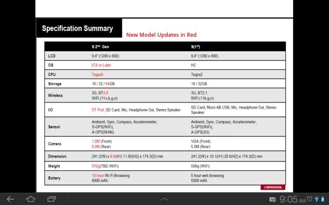 Las especificaciones son bastante atractivas. Vendrá con un procesador NVIDIA Tegra3,  16GB, 32GB o 64GB de memoria interna, cámara trasera de 8Mpx y delantera de 1Mpxconectividad 3G, Bluetooth 3.0, WiFi, A-GPS y una batería de 6000mAh. También es extremadamente delgada, debido a sus 8,8 milímetros de grosor. Además, está fabricada con un recubrimiento de aluminio que evita que le penetre el agua. En cuanto al sistema operativo, sabemos que montará Android 4.0 Ice Cream Sandwich, aunque no descartan las actualizaciones al haber dicho: «Puede que monte ICS, o algo más». Es notoría la forma en que dejan una puerta entreabierta a Jelly Bean, aunque no se atreven a aventurar nada, por ahora.