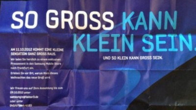 Todos los usuarios de android que no compraron el Samsung Galaxy S3 por su tamaño pueden estar contentos, ya que la empresa coreana ha enviado una invitación para un evento que tiene fecha el 11 de octubre, en el aparece un título que ha sido traducido como: «El tamaño puede ser pequeño», también trae un subtitulo: «y tan pequeño puede ser grande», la filial alemana de Samsung ha publicado otro texto, traducido como: «eso es lo grande que pequeño puede ser», según TechRadar, también pone «el 11.10.2012 llega una pequeña sensación por todo lo grande». En la invitación aparece el logo de la familia Galaxy S.