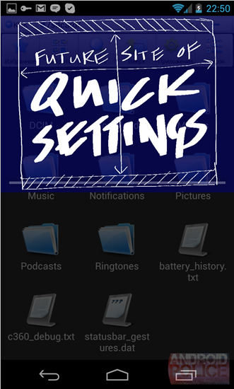 Y la primera novedad que han descubierto los chicos de Android Police es que esta versión introducirá una doble barra de notificaciones. Al parecer, la segunda barra de notificaciones (que se superpondría sobre la normal) mostraría los tipicos ajustes rápidos que encontramos desde hace mucho tiempo en dispositivos como los Samsung Galaxy y algunos HTC, o al menos eso indica la imagen que aparece al realizar el segundo deslizamiento (imagen de la derecha).