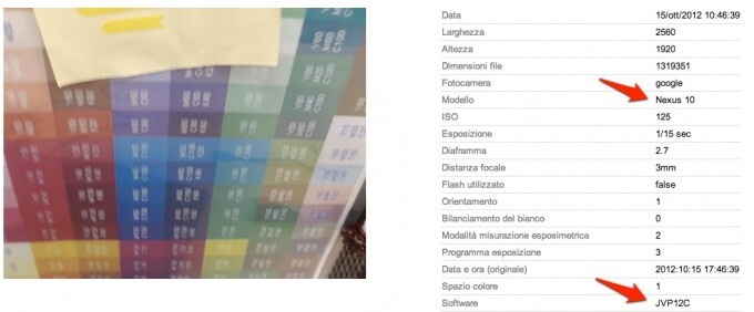 La foto en cuestión es la que veis sobre estas líneas. A priori puede parecer una foto normal, pero si nos fijamos en las caracterísiticas de la cámara veremos detalles como el nombre Nexus 10 o la versión de software JVP12C que es un distintivo claro del los dispositivos Nexus. Más allá de eso se han filtrado también varias características técnicas que puedes hacer de este Nexus 10 la tablet de referencia.