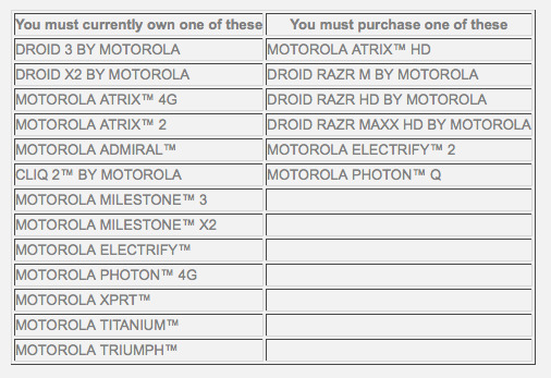 Como vemos, si tenemos un terminal de la columna de la izquierda (no actualizable), nos podría interesar hacernos con uno de la derecha, y para ello nos ofrece una bonificación de 100$. Por otra parte, obviamente el mencionado RAZR, así como los posteriores teléfonos sí recibirán dicha actualización.