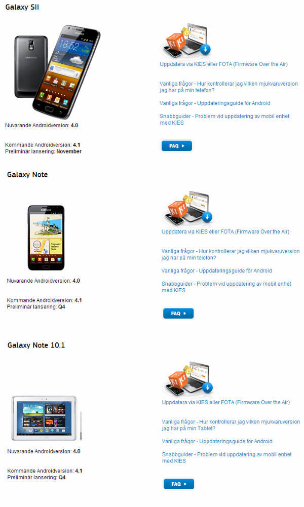 Según Samsung, a finales de este año 2012 estos 3 terminales deberían ser actualizados; por una parte, el SGS2 recibiría su racion de «golosinas» en noviembre, mientras que los otros 2 durante el Q4, así que casi seguro que hasta diciembre nada de nada. Se espera que las actualizaciones estén disponible via OTA o a través de KIES, pero personalmente soy partidario de la primera opción, ya que facilita mucho las cosas.